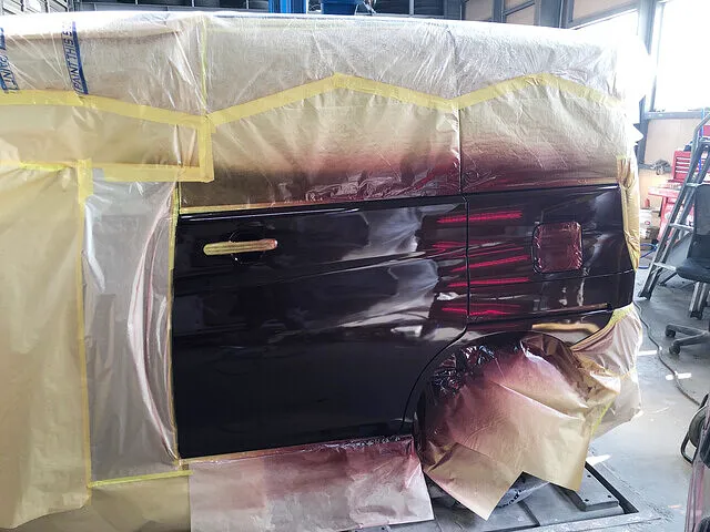 一連の鈑金作業を終えたら塗装作業へ移ります。当社では、チリやホコリをシャットアウトした塗装専用ブースを完備しているので、よりキレイに塗装を仕上げることができます。
