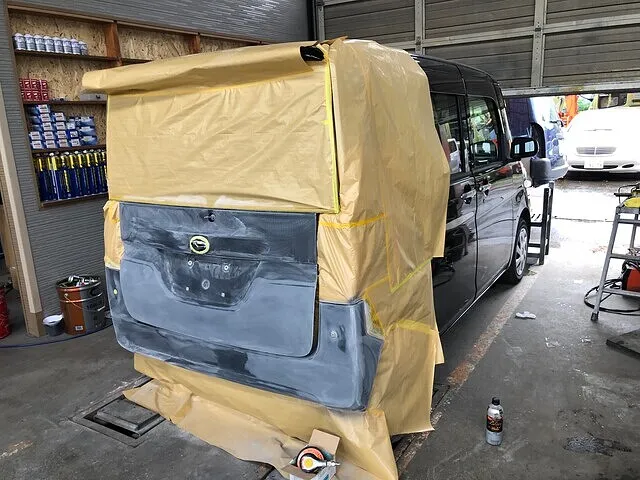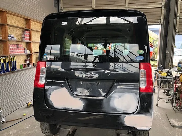 ダイハツ タントのバックドア・リアバンパーの擦り傷修理にあたって、鈑金塗装を行いました。