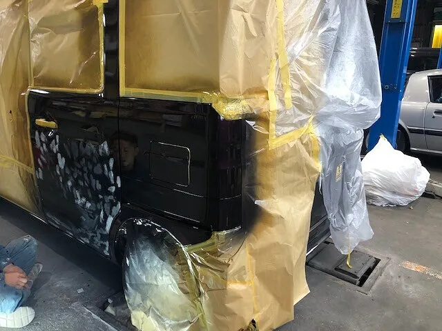 スズキ スペーシア カスタムのリアドア・リアフェンダー・サイドステップの擦り傷修理にあたり、鈑金塗装をいたしました。