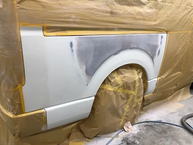 まずは鈑金作業でキズ・へこみの修復。傷周辺をサンディングで整えて、へこみを修復したら、サーフェイサーという下地処理剤を塗布。サーフェイサーは液体のパテなので、軽度の傷であれば埋めることができます。サーフェイサーの塗布が終われば、サンディングで段差を取って表面を滑らかにします。