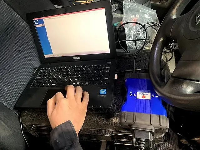最後に、今回お客様に持ち込んでいただいたのはスズキ純正品のエンジンスターターになるので、スズキ車専用の自動車整備機器”SDT-Ⅱ”を使ってエンジンスターターの登録をし、すべての作業が完了!