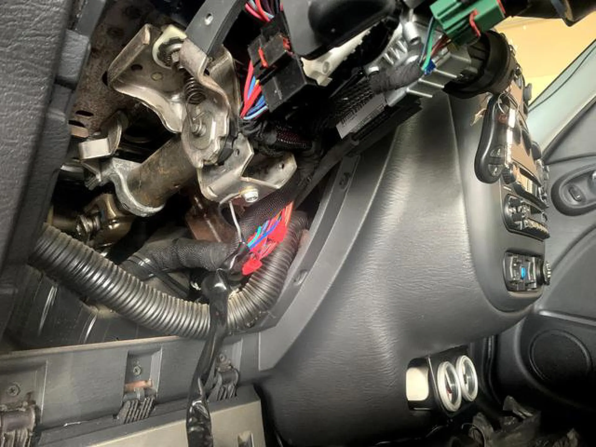 コラムカバーを外しますが、国産車と勝手が違うので作業に四苦八苦(汗)検電テスターなどを用いながら導通も確認していきます。