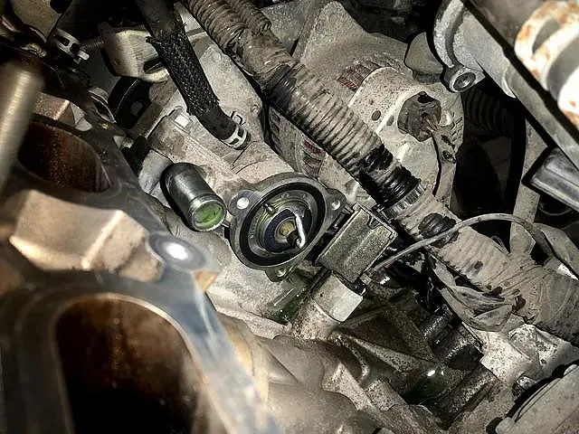 新品のサーモスタットに交換し、外した部品などを元に戻して冷却水のエア抜きを終えたら作業完了。